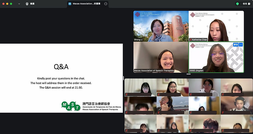 感謝 Professor Li Sheng(The Hong Kong Polytechnic University)帶領團隊Yingnan Li, MA、Katherine Chan, Speech Therapist、Jingbo Zhang, Msc、Jingdan Yang, MSc分享最新研究成果,聚焦於言語、語言和溝通需求青少年。